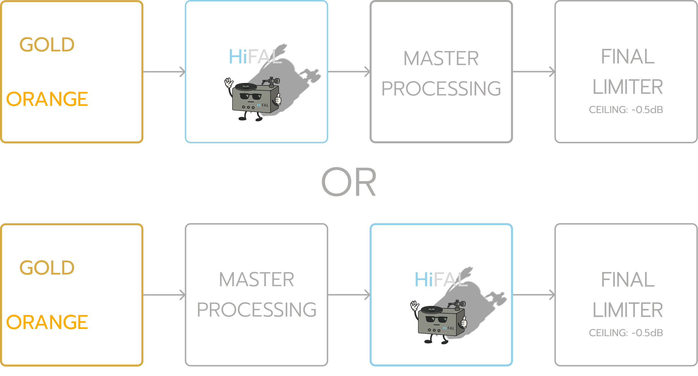 In most mixes, I place Gold Clip or Orange Clip first, then HiFAL, either early in the chain or directly before the final limiter.