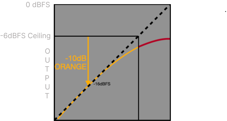 The ceiling control simplifies clipping by allowing you to move the clip point below 0.0dBFS. The ceiling sets the top of the wave shaper, while the ORANGE knob determines the bottom. For example, if the ceiling is set to -6dBFS and ORANGE to -10dB, wave shaping begins at -16dBFS. Input signals below -16dBFS remain linear, signals between -16dBFS and -6dBFS are wave-shaped, and signals above -6dBFS approach hard clipping.
